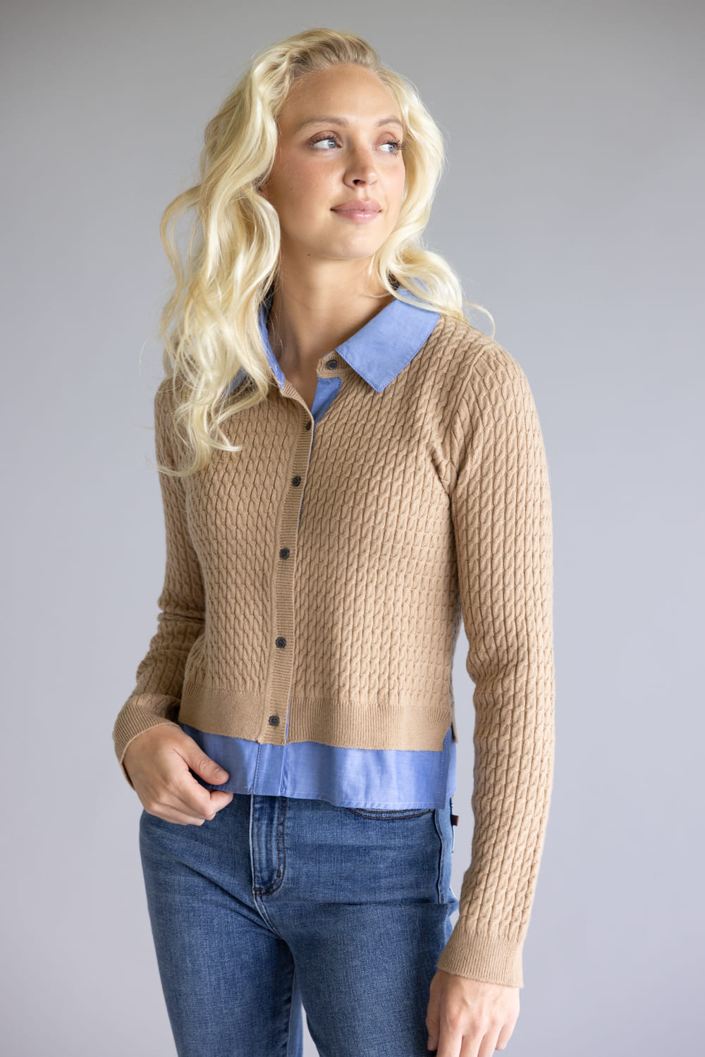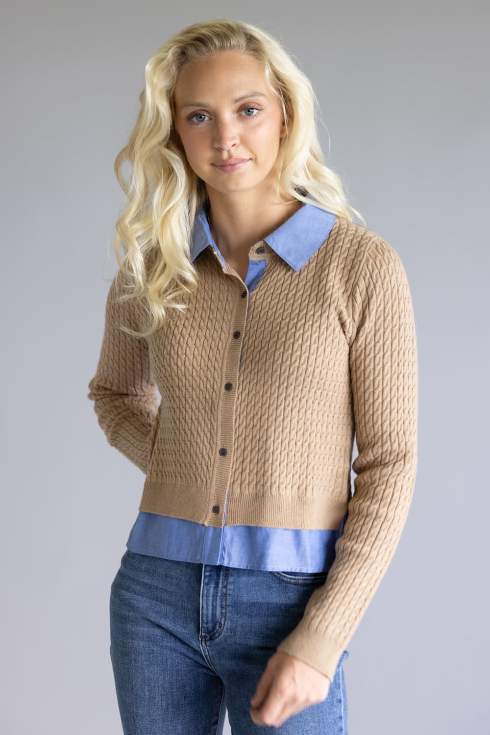 Stay stylish and comfortable all season long in this Aaron & Amber Cable Knit Mixed Media Button Front Top for Women in Taupe! This sweater features an adorable cable knit design, attached collar and under shirt elements and a button front to top it off. Dress this sweater up or down for any occasion!