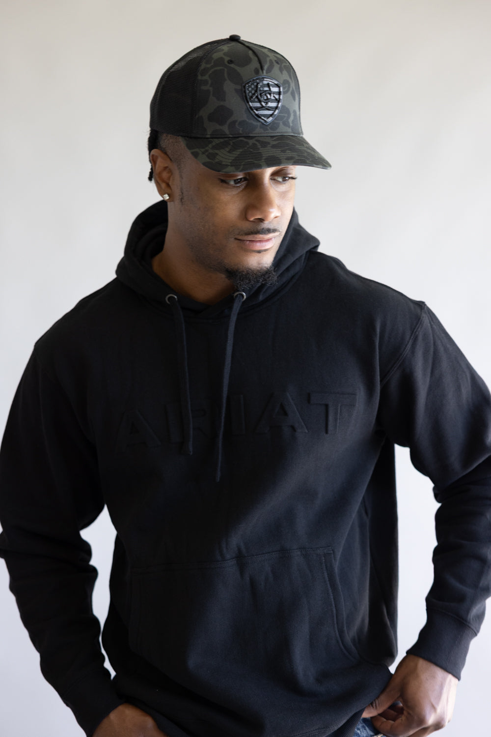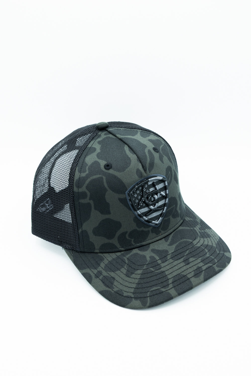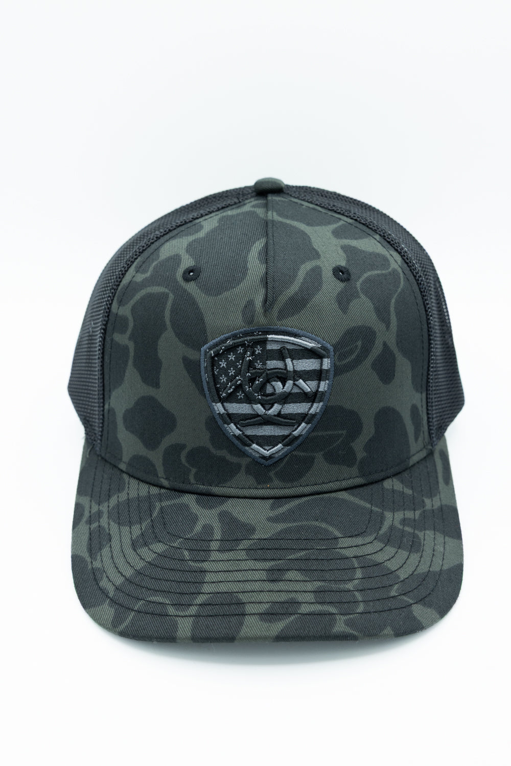 This Ariat Embroidery Shield Snapback Hat for Men in Black features a black and grey camo front panel and bill. The black mesh back ensures breathability, while the snapback closure allows for an adjustable, secure fit.