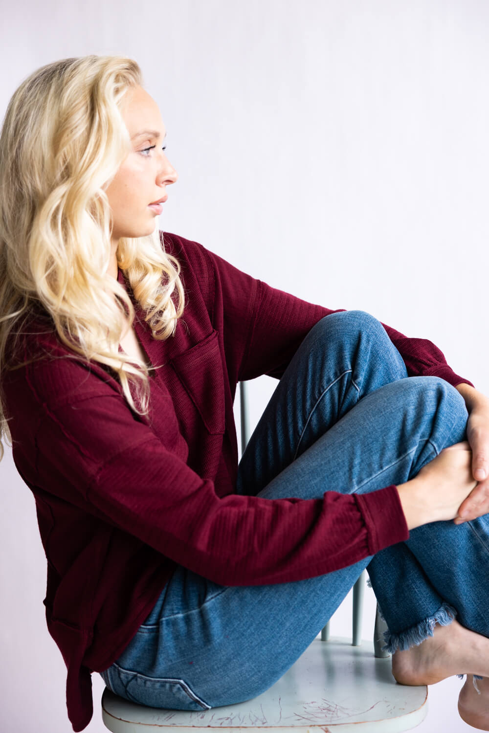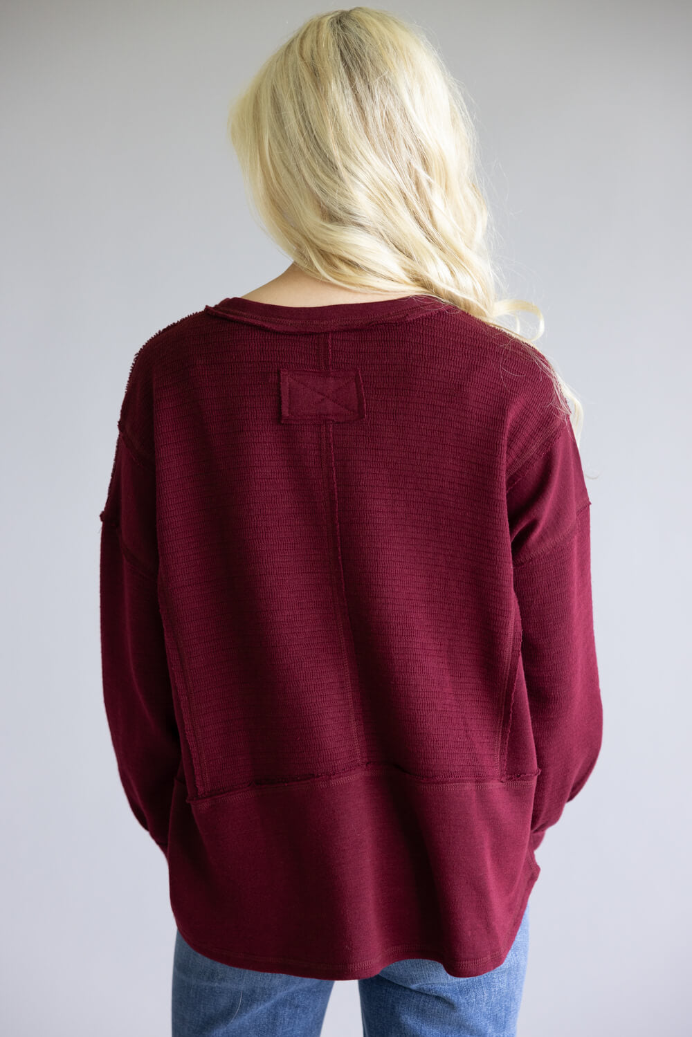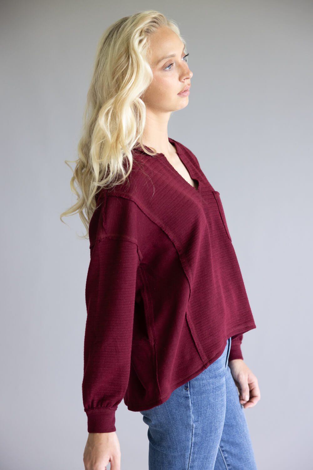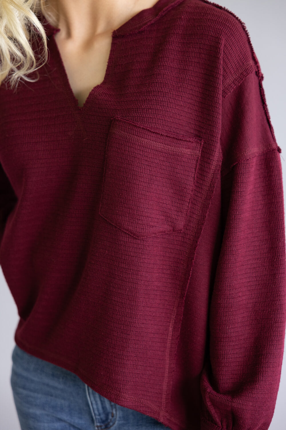 Get your hands on this Blu Pepper Notched V-Neck Knit Top for Women in Deep Red. This long sleeve shirt is going to be a go to for you. Featuring a V-neck cut, notched pattern, and a beautiful color. Check it out today!