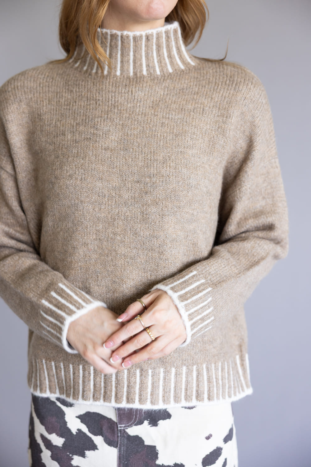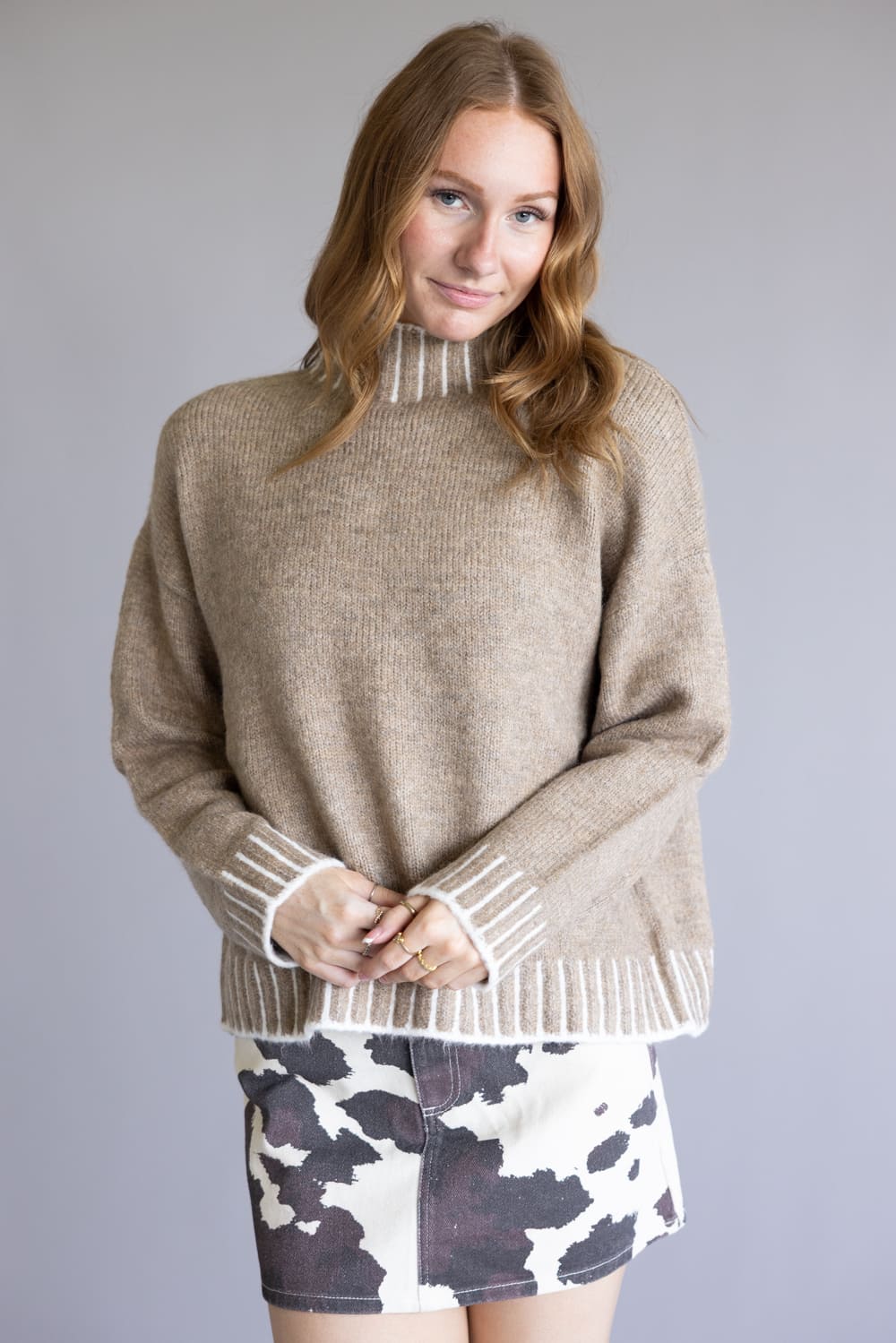 This Elan Blanket Stitch Mock Neck Sweater for Women in Tan gives you a luxurious and stylish look with its neutral colors, long sleeves, and soft fabric!