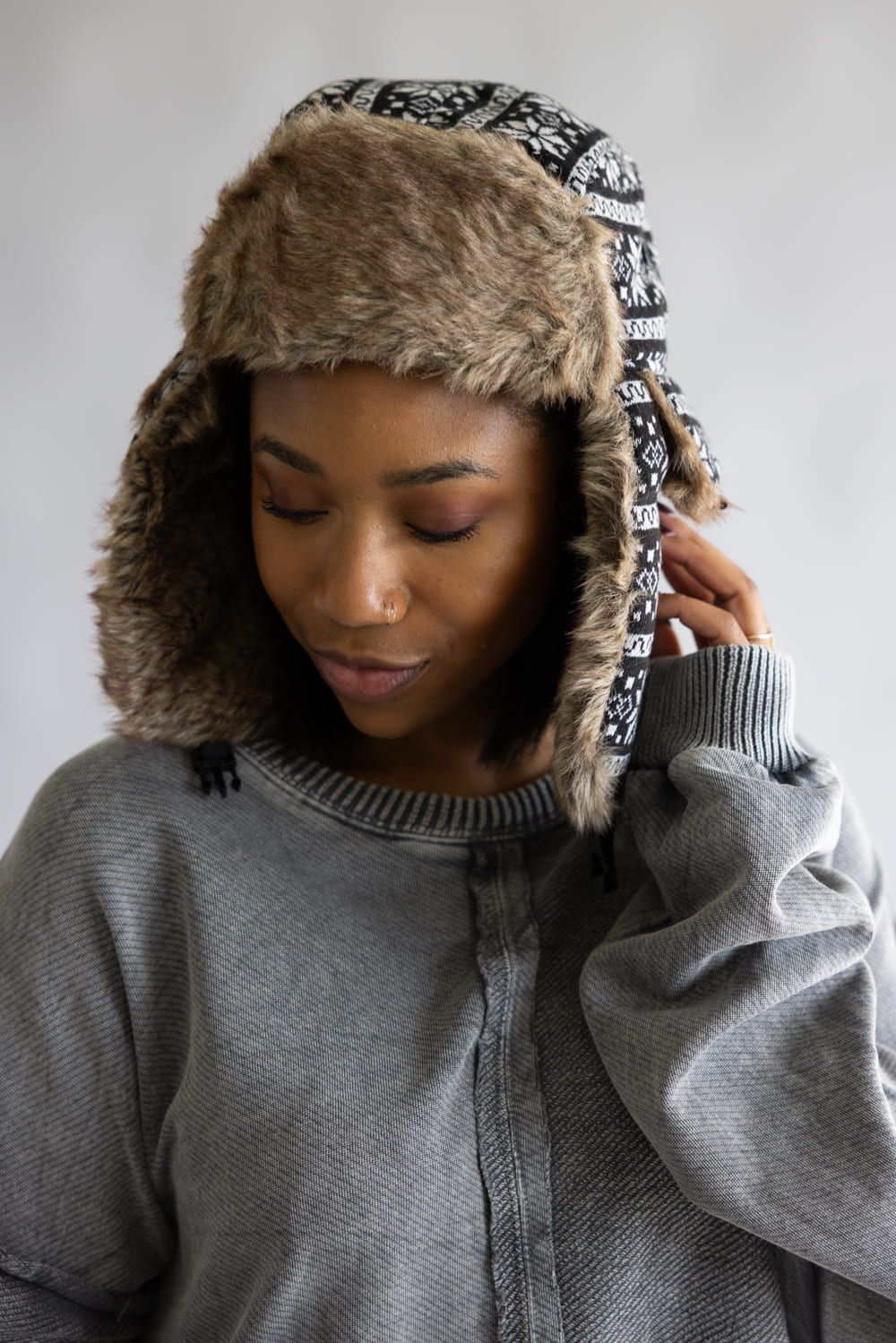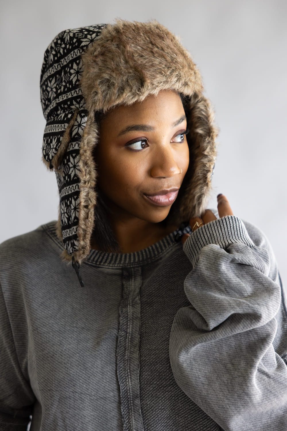 Faux Fur Trapper Hat for Women in Snowflake Black