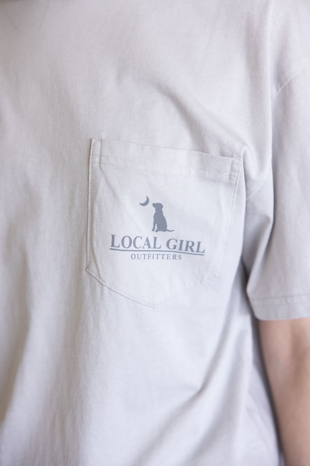 Show off your western pride with the Local Girl Flora Dog and Moon T-Shirt for Women in Grey. Comfortable and stylish for any casual occasion.