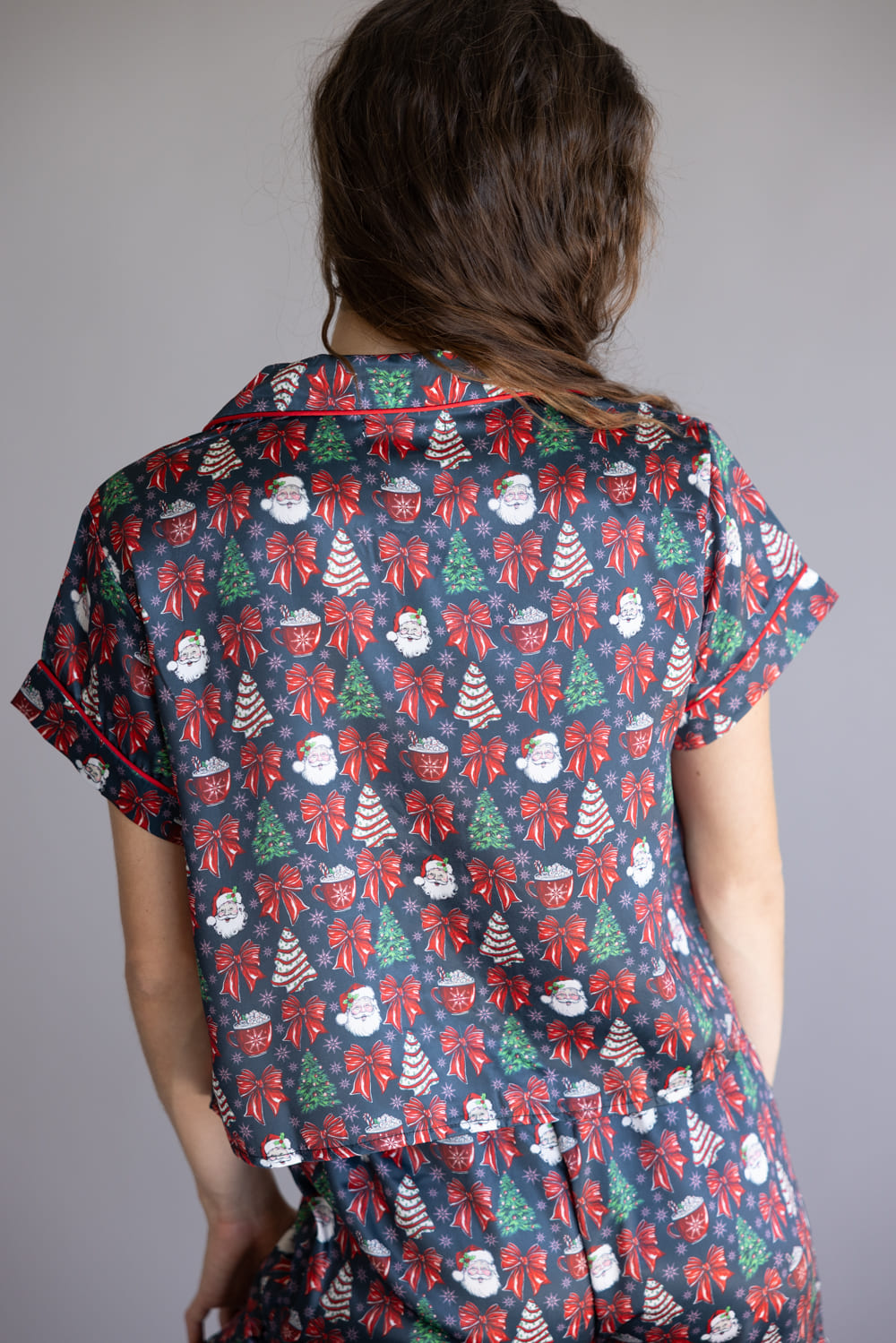 Sleepover Goals: Unlocked! This Simply Southern Holiday Satin Pajama Set for Women in Black Multi is giving all the girly, glam pajama party vibes. The satin fabric and fun red fuzzy ribbon make this pajama set perfect for the holiday season.