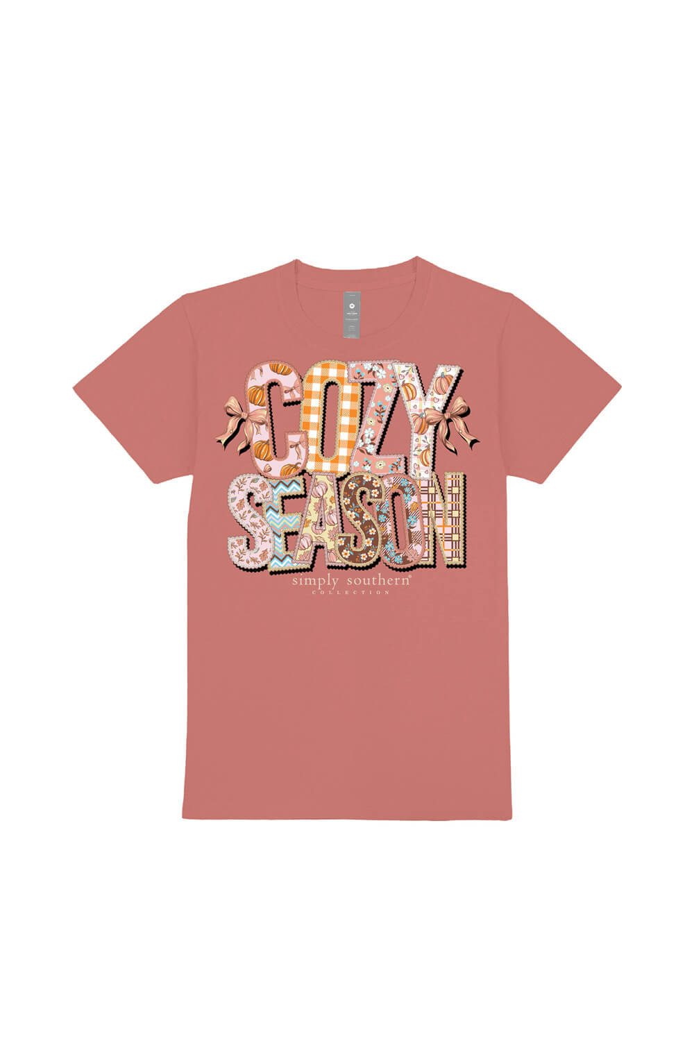- Front Graphic: Front reads “Cozy Season” in bold letters with fall print. Featuring bows, pumpkins, plaid, and fall floral. The Simply Southern logo is placed below the graphic.